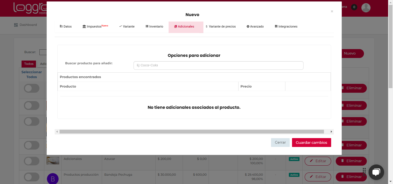 En esta ventana puedes seleccionar los productos adicionales o complementarios al que estas creando. Para esto, desde el menú desplegable selecciona el producto a adicionar y da clic en Agregar (+).