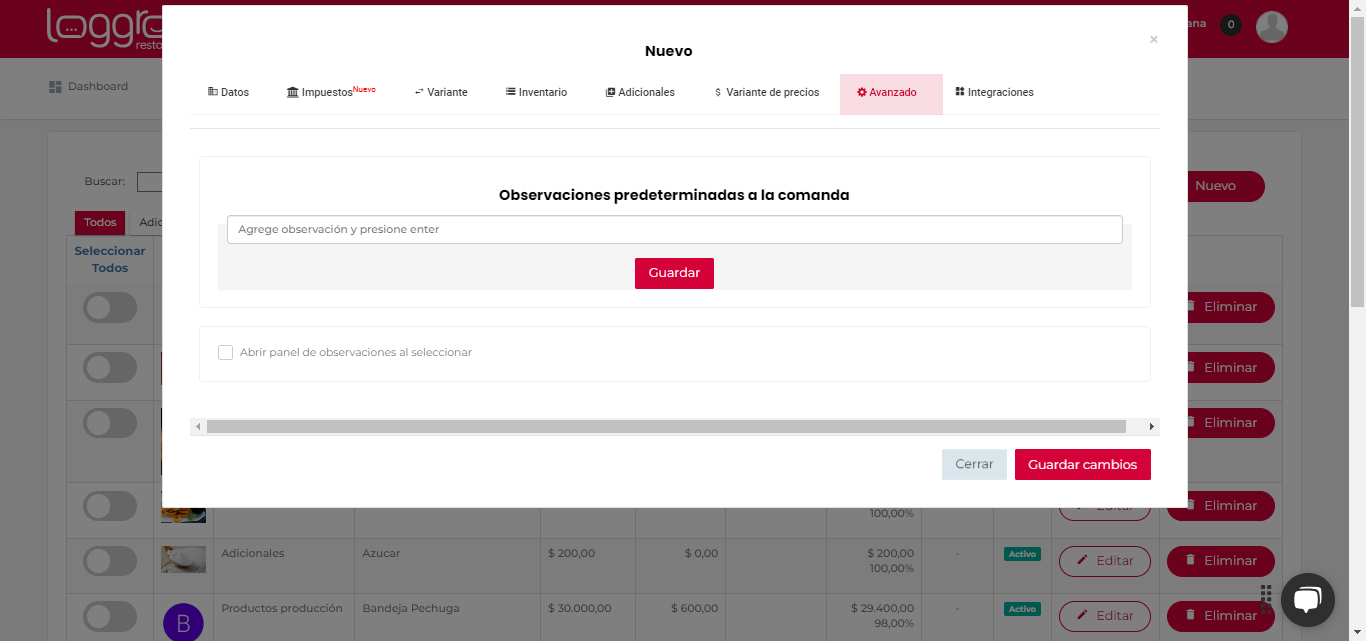 Puedes indicar si deseas que se abra el panel de observaciones al seleccionar el producto, para esto activa la casilla de verificación en la parte inferior de la pestaña.