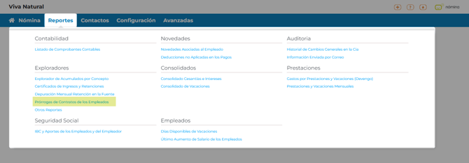 - Selecciona la sección Reportes → Prórrogas de Contratos de los Empleados.