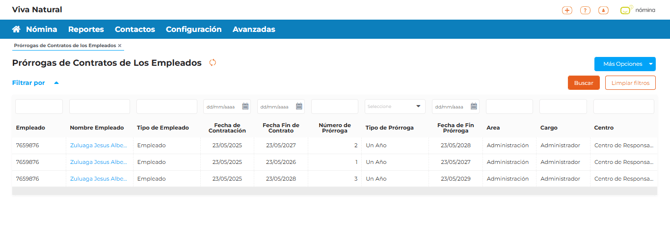 Cada prórroga ocupa una fila independiente en la tabla. Si a un empleado se le ha prorrogado el contrato dos veces, aparecerá dos veces en el reporte, con el número de prórroga correspondiente (1 y 2).