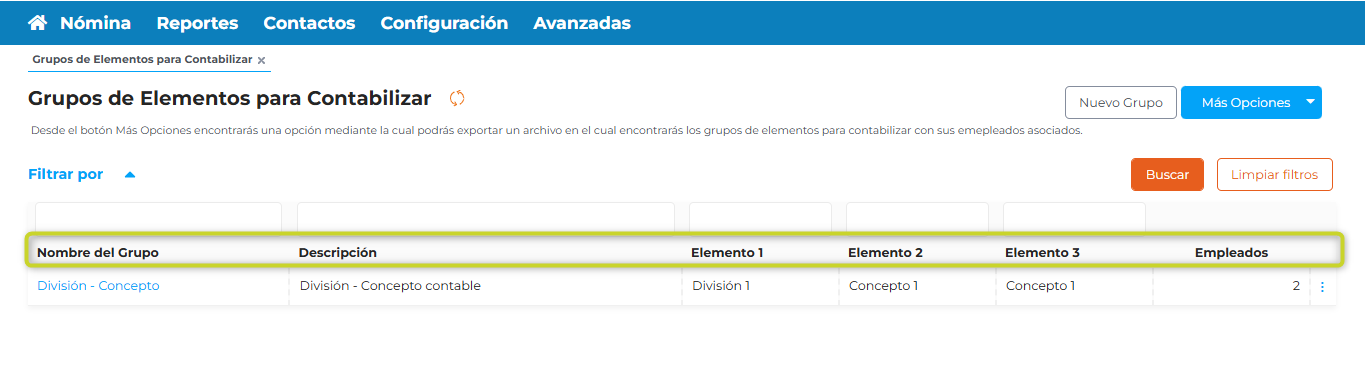 - Los Grupos de Elementos para Contabilizar permiten personalizar la contabilización de nómina.