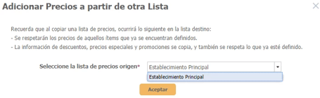 Importante: Este proceso de copiar una lista de precios de otro establecimiento también copia los descuentos, precios especiales y promociones definidas en la lista de origen.
