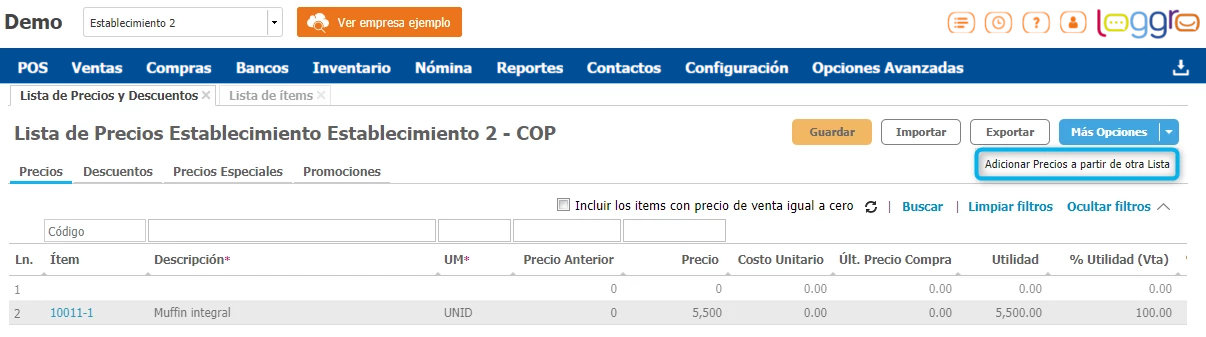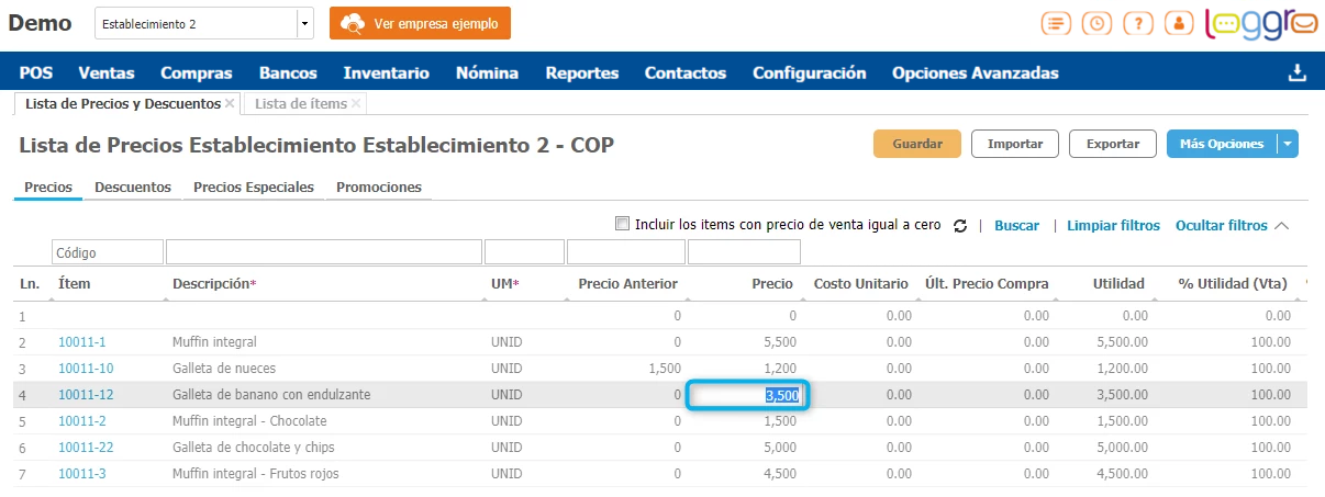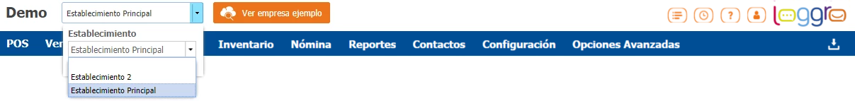 En Loggro los ítems que cargues o crees manualmente se manejan a nivel de toda la compañía. Si utilizas lista de precios por establecimiento, debes ingresar a cada uno de estos desde la parte superior del sistema y realizar la configuración de su precio de venta.