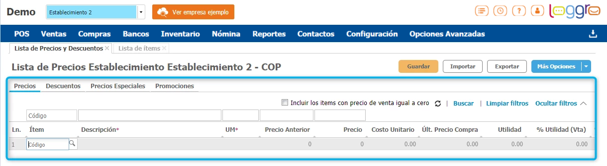Puedes verificar que la ventana se encuentra vacía y disponible para que realices la configuración de precios deseada y poder generar ventas de los productos.