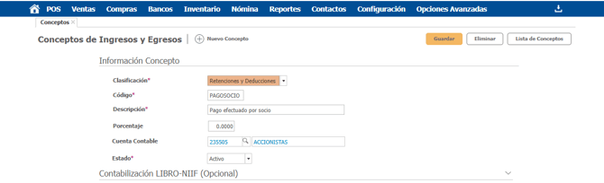 Al dar clic en Nuevo Concepto debes tramitar la información respectiva, recuerda que este debe ser de clasificación Retenciones y Deducciones y la cuenta contable asociada será la cuenta por pagar a socios.