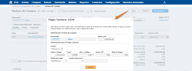 A continuación te mostramos un ejemplo: - Dirígete a la factura de compra y da clic en Pagar.