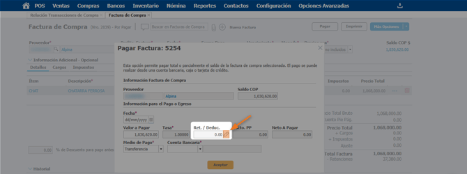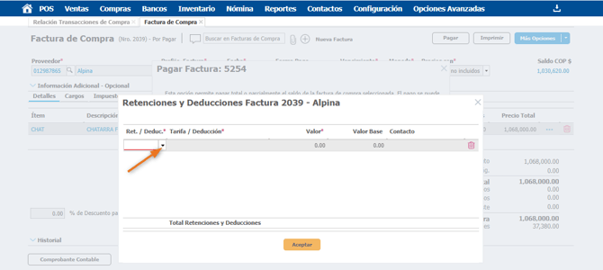 Ret. / Deduc: Despliega el menú de este campo y selecciona Deducción.