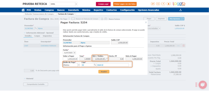 Verifica la información y da clic en Aceptar, puedes visualizar que en la ventana de pago se lleva la información de la deducción y debes continuar ingresando los datos del medio de pago.