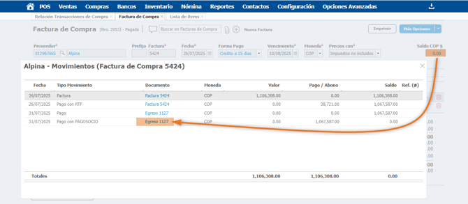 Contacto: Puedes indicar en este campo el contacto específico que realiza el pago (el socio). Si dejas este campo en blanco se tomará como contacto el proveedor relacionado en la factura de compra.Para finalizar el pago del documento da clic en Aceptar. Con esto la factura de compra pasa a estado Pagada y si das clic en el saldo puedes verificar como fue pagada.