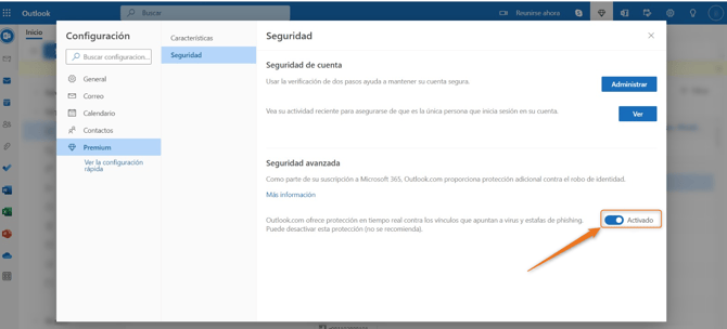 - Desde tu correo electrónico ingresa a Configuración → Seguridad → Premium.
