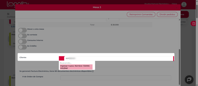 Allí ingresa el número de identificación del cliente, si este se encuentra registrado en la DIAN se mostrarán de forma automática su nombre en el sistema.