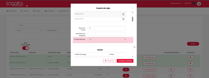 Da clic en Nueva para realizar apertura de la caja, al hacerlo debes seleccionar la unidad de medida que maneja la báscula ya sea Gr o Kg y finaliza dando clic en Guardar cambios.