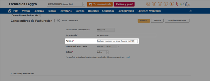 La configuración adicional la realizas des Loggro Pymes, ingresando a Configuración → Consecutivos de facturación, allí das clic en Nuevo Consecutivo, diligencia los datos y en el campo “Aplica a” selecciona Facturas cargadas por Venta Externa No POS.
