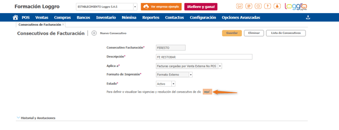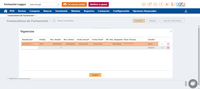 y establece los datos del consecutivo que utilizas para facturación electrónica en Loggro Restobar.