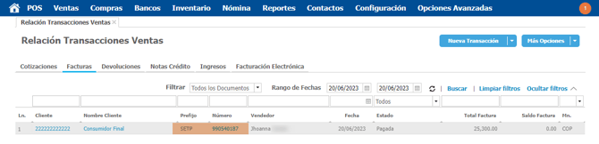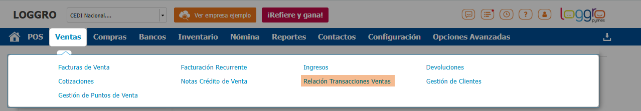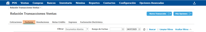 Desde Loggro Pymes podrás identificar las facturas electrónicas sincronizadas ingresando a Ventas → Relación Transacciones Ventas. Luego desde la pestaña Facturas.