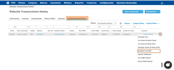 Adicional, si consultas desde la pestaña de Facturación Electrónica puedes verificar la información de dicho documento electrónico en la DIAN.