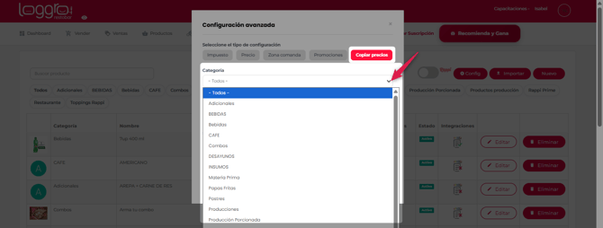 Selecciona la opción Copiar precios, posteriormente indica la Categoría a la cual se debe aplicar la modificación.
