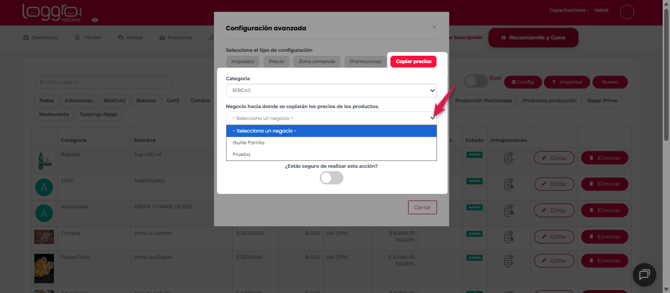 Luego de esto, selecciona el negocio al cual se copiarán los precios.