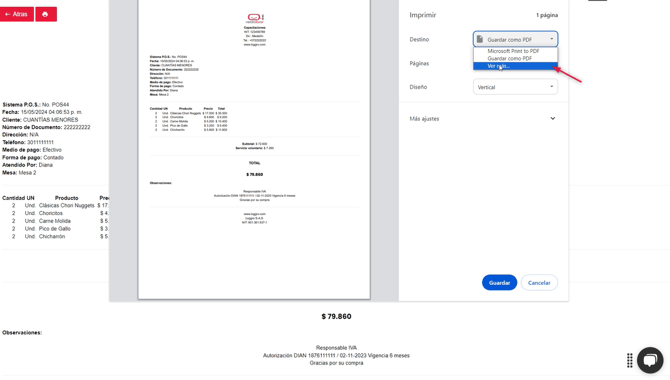 - Despliega el campo Destino y confirmar que se encontró correctamente la impresora. De lo contrario puedes seleccionarla dando clic en la opción Ver más.