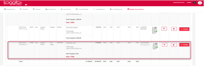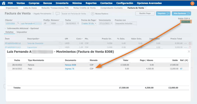 Al verificar la factura en Restobar se visualiza el respectivo abono y la disminución de la deuda.