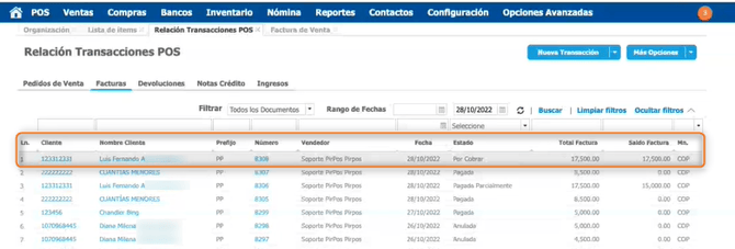 Al ingresar a Loggro por la ruta POS → Relación transacciones POS y actualizar la información puedes visualizar la factura a crédito sincronizada.