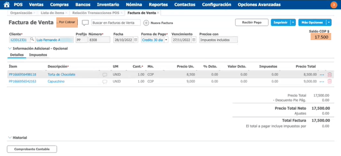 Podemos identificar que su estado es Por Cobrar y se muestra el saldo pendiente del documento.
