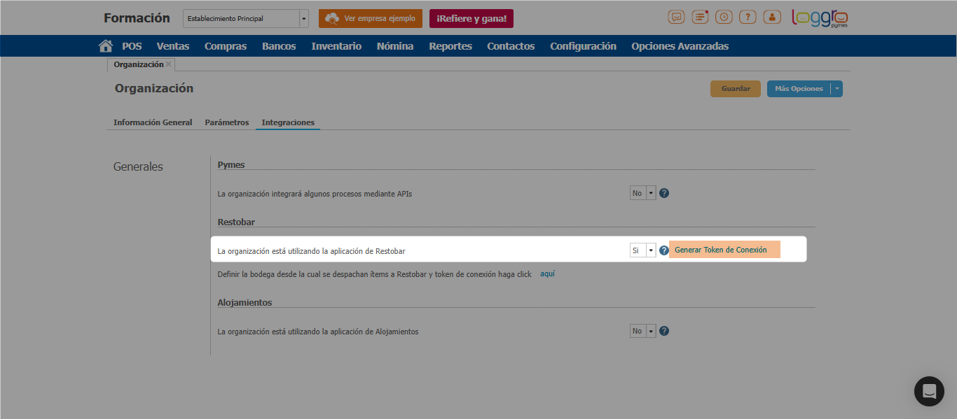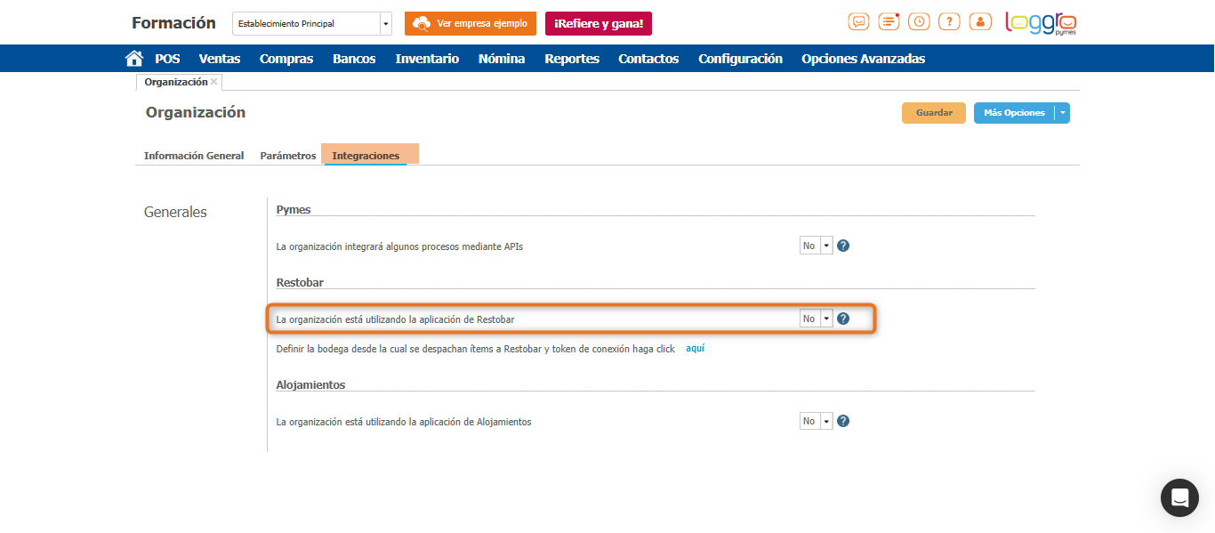 Que configuraciones se deben realizar para integrar Restobar con Loggro Pymes