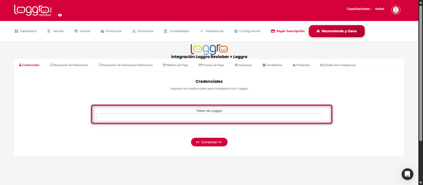 - En la ventana de ‘Credenciales’, debes introducir en el campo ‘Token de Loggro’ el token previamente gestionado y dar clic en el botón ‘Conectar’