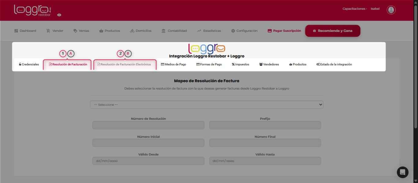 1A. Mapear la Resolución de Facturación: Si deseas sincronizar las facturas POS (no electrónicas), desde el sistema Restobar debes ingresar a la pestaña ‘Resolución de Facturación’ y seleccionar en el menú desplegable la resolución previamente creada en Loggro Pymes.