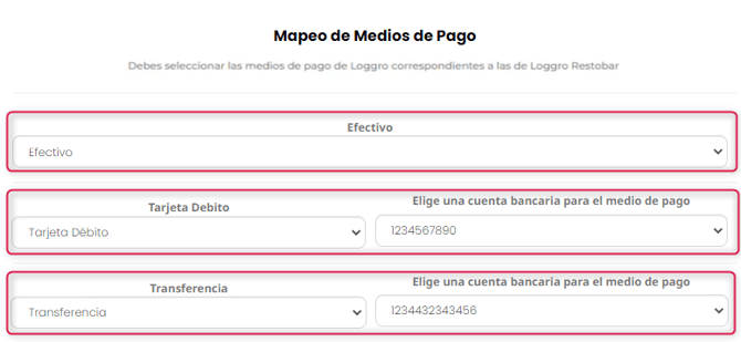 2. Mapear los Medios de Pago: Ingresa a la pestaña ‘Medios de Pago’ y realiza un mapeo de los medios de pago creados en Restobar con los existentes en Loggro Pymes. Adicional, debes asociar a cada uno de ellos la cuenta bancaria con la que se realizará la recepción de ingresos para los pagos con tarjetas de débito, crédito, consignaciones, transferencias, etc. (excepto pagos en efectivo).